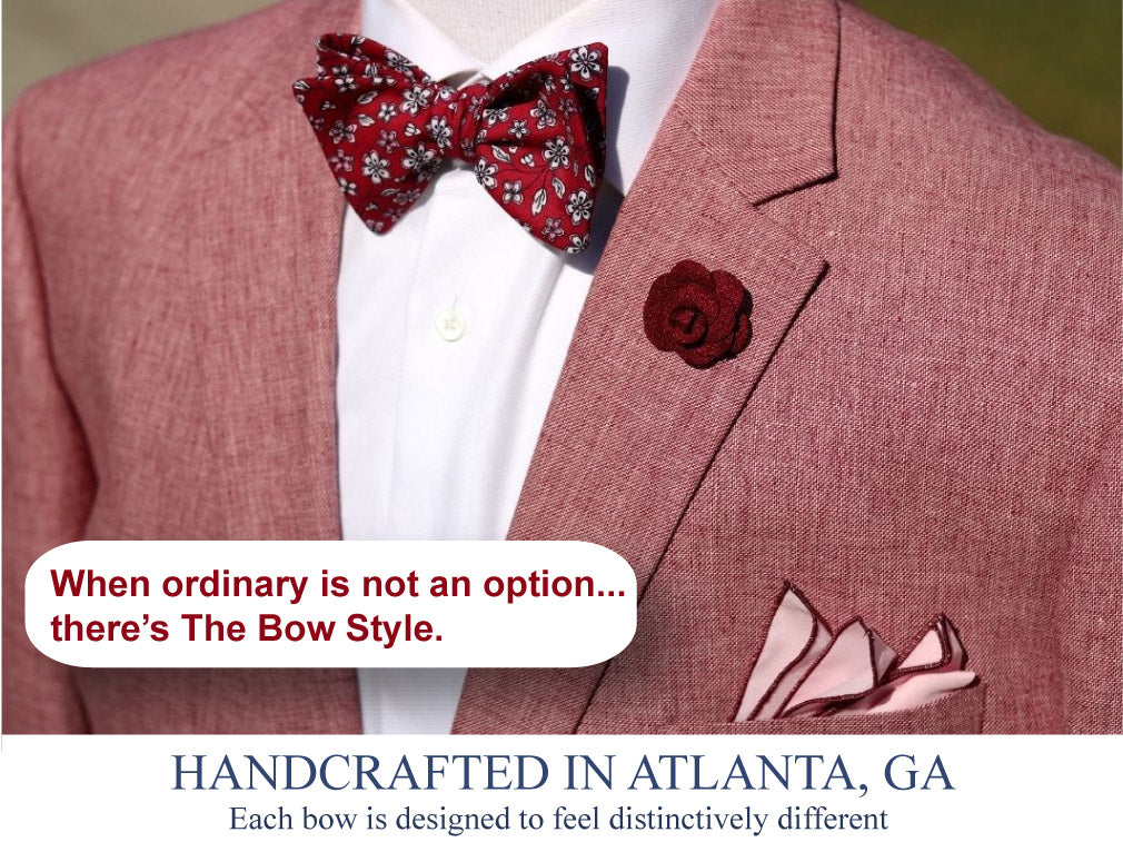 Our StoryThe Bow Style is a Black Owned US Company located in Metro Atlanta. Since our inception have made it our goal to handcraft bow ties and accessories to compliment the gentleman's wardrobe. Our bow ties are made from a variety of high quality woven or printed silks, silky soft satins, plush super smooth velvets and premium cottons. We are dedicated to delivering high quality products and excellent customer service every time. All materials are hand selected, hand sewn, hand crafted and individually inspected to meet our high standards. Our products are shipped from our design studio. Learn more about us by clicking the tab "Our Story" in the main menu.