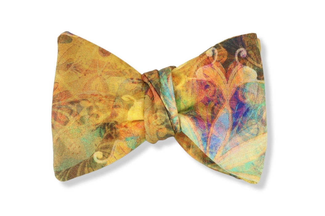 Handmade Self-tie bow tie with flowers add splashes of colors to a gentleman's outfit. The vibrant colors of this handmade bow tie features gold, teal, brown and blue makes any outfit standout.