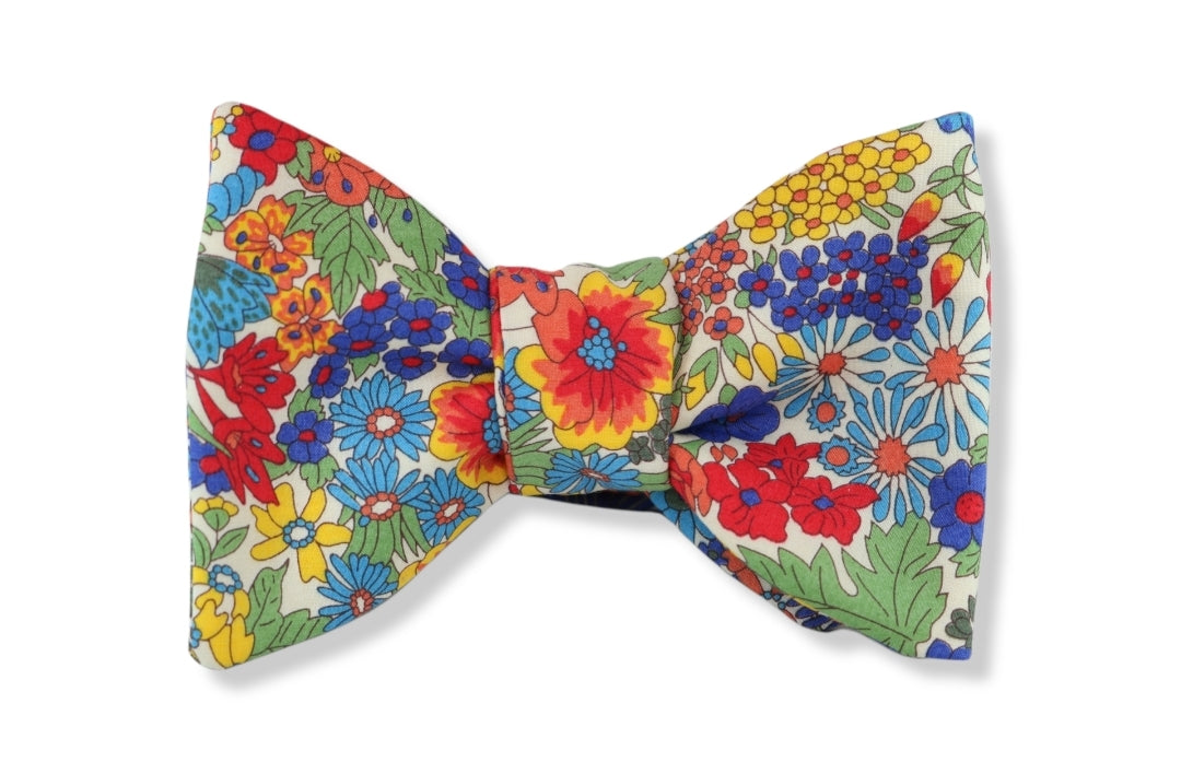 A selftie bowtie for the dapper gentleman made of Liberty fabric is always the perfect detail to add. Red, orange, blue, yellow, green, and white floral butterfly design makes for an amazing modern bow tie. It easy transforms from casual, formal or business depending on the occasion. Perfect for a green blue, beige, gray, tan or gold suit.