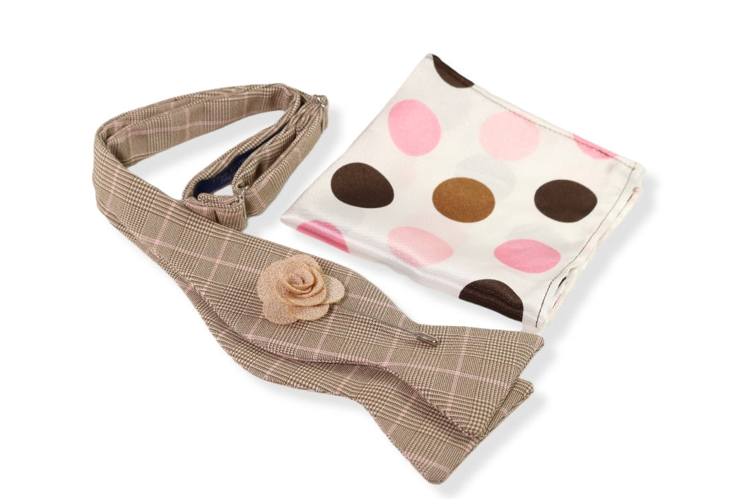 Individually handcrafted by The Bow Style to elevate the style of a gentleman. The baylor brown and pink plaid bow tie paired with the pink and brown polka dot pocket square with a beige floral lapel pin. Perfect dapper details for business, fun, casual or formal occasions. When ordinary is not an option these sets are ideal as gifts that will bring lots of compliments and attention.