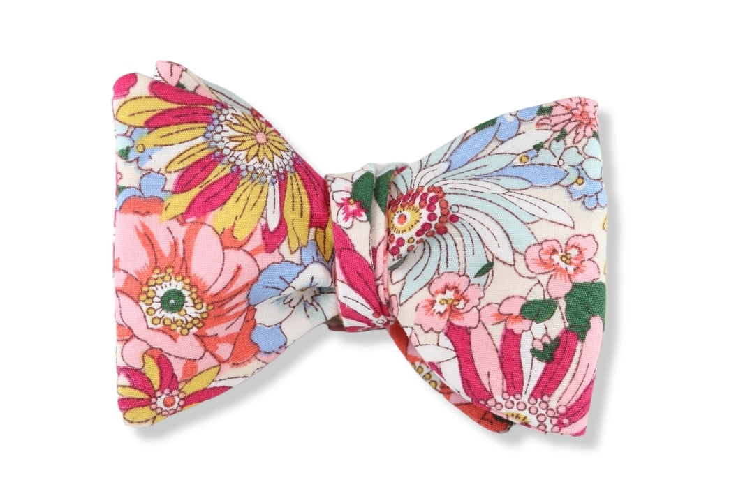 A self-tie bow tie never goes out of season. Blue, gold, green, pink and burgundy floral butterfly design makes for an amazing modern bow tie. It easy transforms from casual, formal or business depending on the occasion. Perfect for a blue, beige, gray, brown, tan or gold suit.