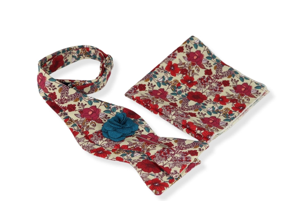 Individually handcrafted by The Bow Style to elevate the style of a gentleman. The canbury floral burgundy, teal and yellow premium cotton bow tie is paired with the canbury floral rolled hem pocket square with a teal floral lapel pin. Perfect dapper details for business, fun, casual or formal occasions. When ordinary is not an option these sets are ideal as gifts that will bring lots of compliments and attention.