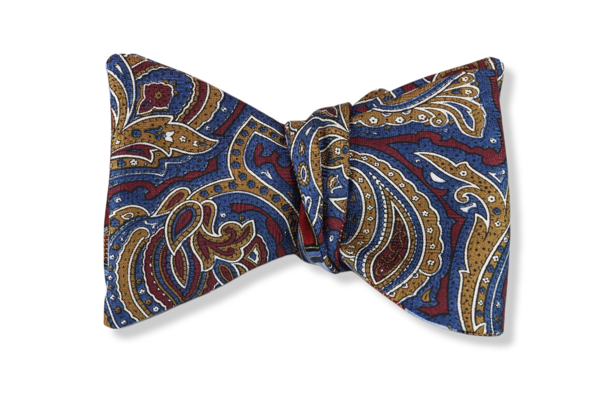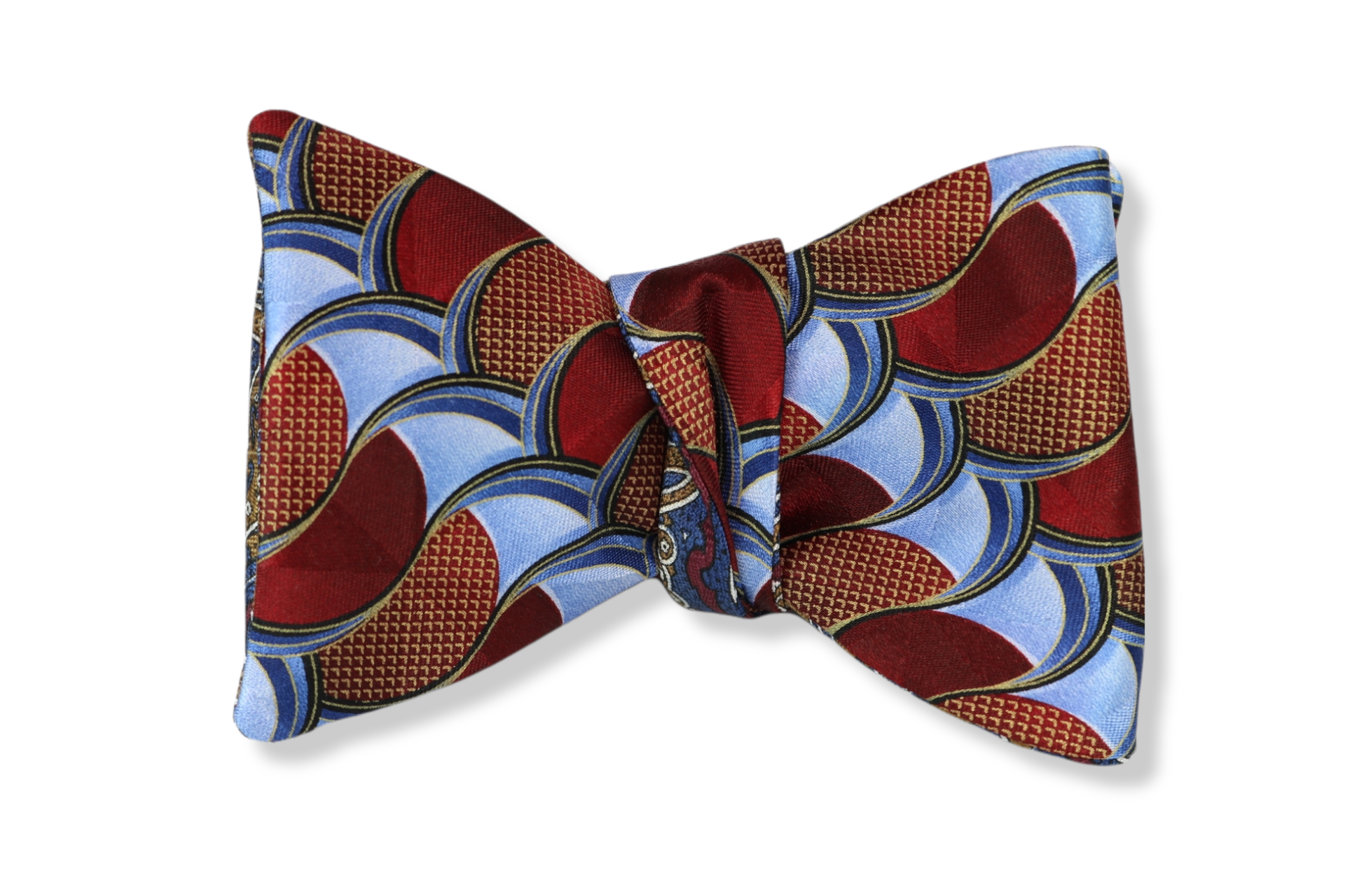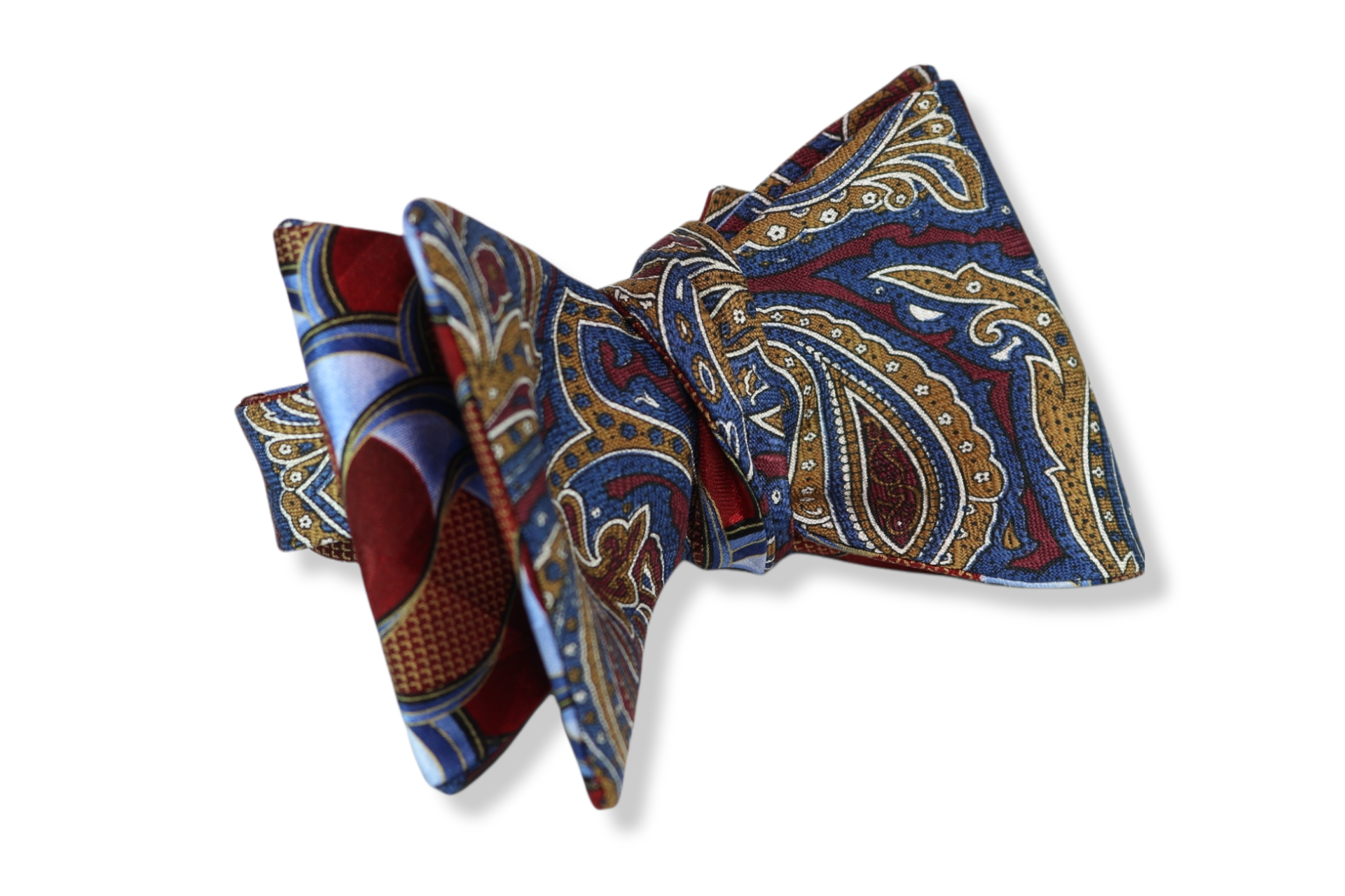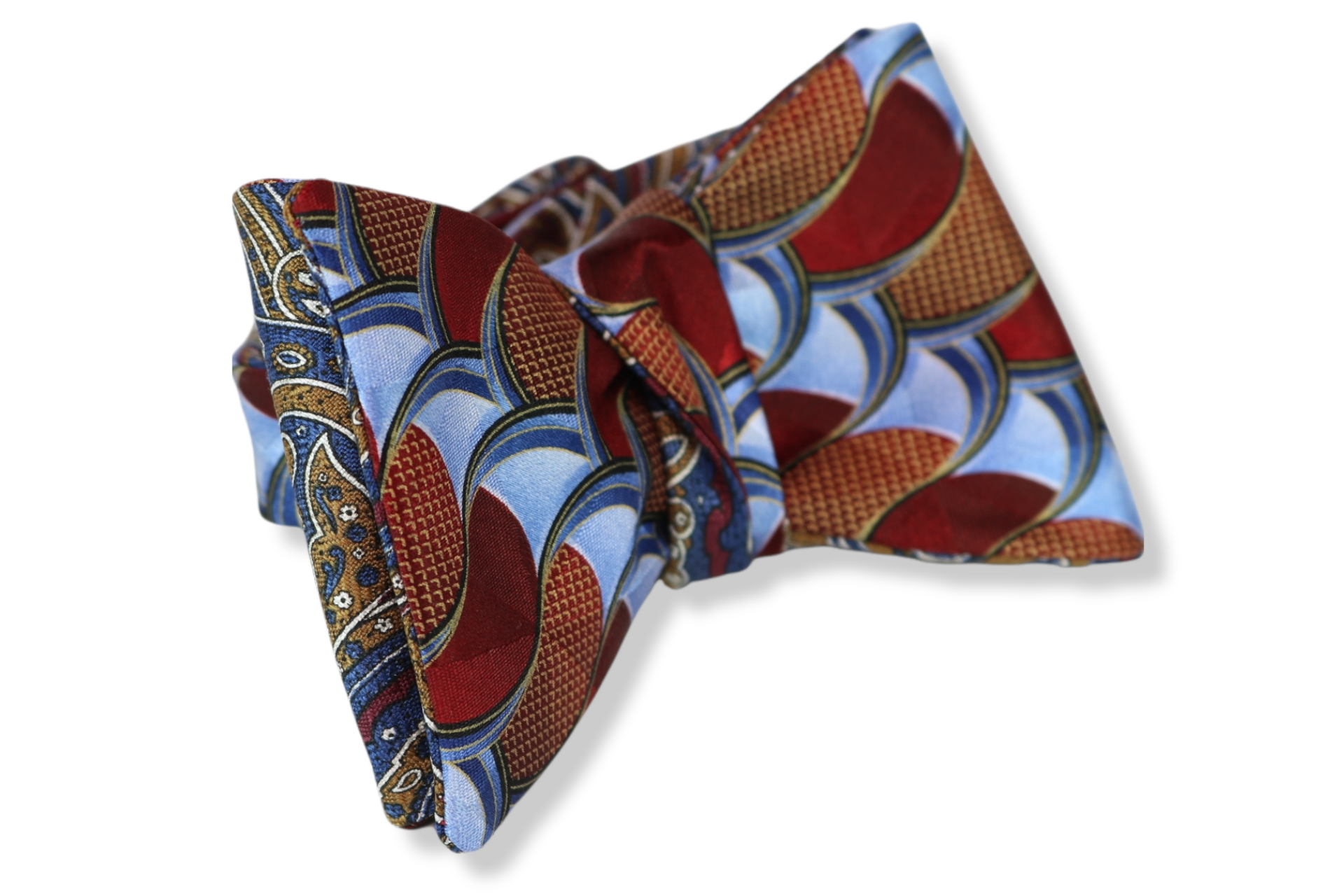 A self-tie bow tie never goes out of season. Red, blue, gold and white geometric and blue, red and gold checked pattern makes an amazing bow tie. It easy transforms from casual, formal or business depending on the occasion. Perfect for a blue, gray, beige, black or brown suit.