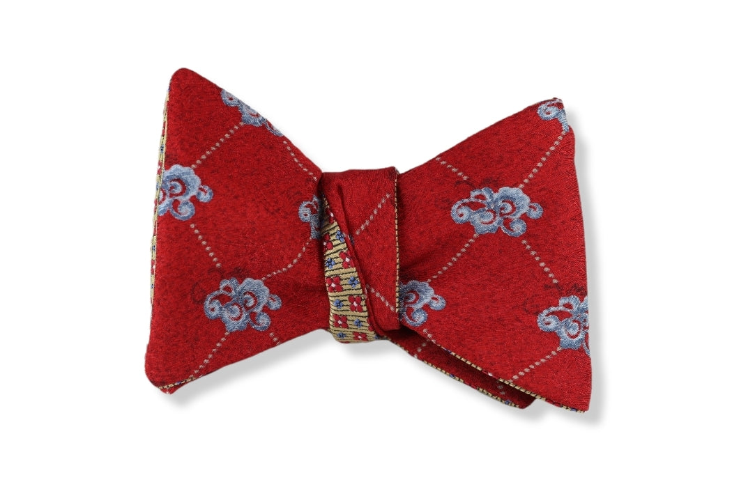 Need more options with your bow tie consider a reversible, two panels or double sided self-tie bow tie. It's like having multiple bow ties all in one. Featuring red and blue floral and red, gold and blue geometric pattern makes for eye catching style accessory.