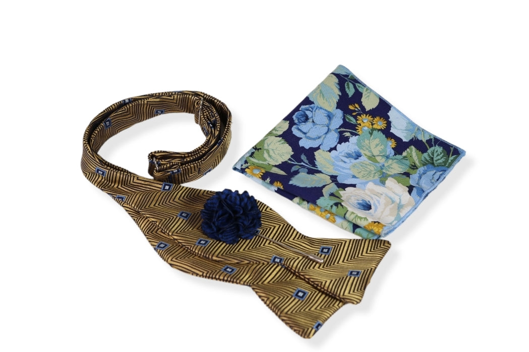 Individually handcrafted by The Bow Style to elevate the style of a gentleman. The finley gold blue diamond woven silk bow tie is paired with the falyn floral pocket square with vibrant colors of blue, green, gold and cream and a gold floral lapel pin. Perfect dapper details for business, fun, casual or formal occasions. When ordinary is not an option these sets are ideal as gifts that will bring lots of compliments and attention.