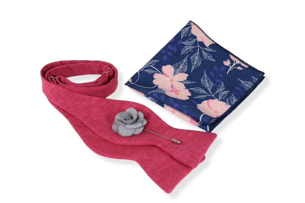 Individually handcrafted by The Bow Style to elevate the style of a gentleman. The fuchsia goleto linen bow tie paired with the pink floral pocket square with a gray floral lapel pin. Perfect dapper details for business, fun, casual or formal occasions. When ordinary is not an option these sets are ideal as gifts that will bring lots of compliments and attention.