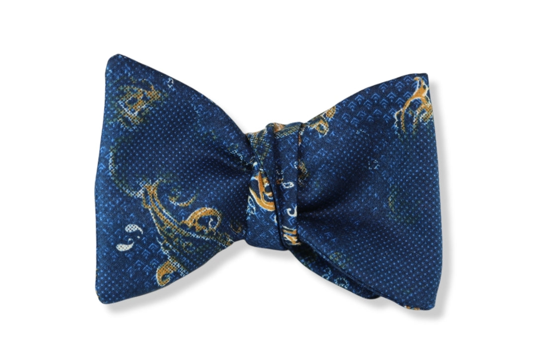 Paisley handmade Selftie bow tie is a must for a gentleman's wardrobe. The vibrant colors of this handmade bow tie features different shades blue and beige colors and makes any outfit standout.