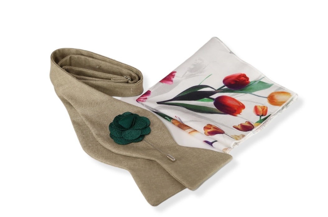 Individually handcrafted by The Bow Style to elevate the style of a gentleman. The Gladston bow tie in taupe color is paired with the Asbury floral pocket square with vibrant colors of white, beige, green, gold and rust and a dark green floral lapel pin. Perfect dapper details for business, fun, casual or formal occasions. When ordinary is not an option these sets are ideal as gifts that will bring lots of compliments and attention.