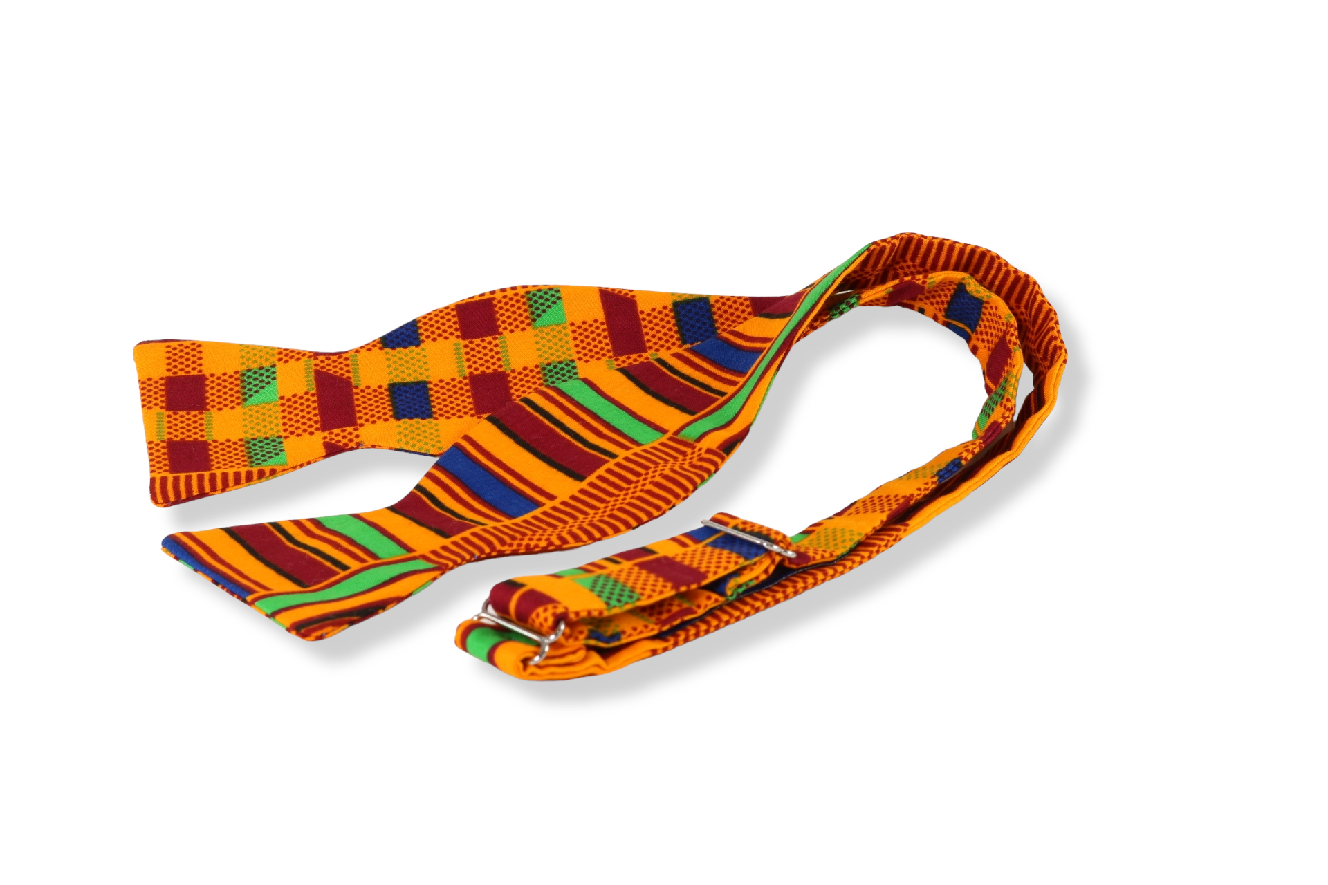 Handmade Self-tie bow tie with traditional African Print adds splashes of colors to a gentleman's outfit. The vibrant colors of this handmade bow tie features yellow, green, burgundy and blue makes any outfit standout.