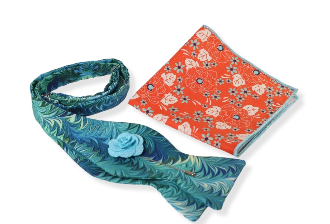 Individually handcrafted by The Bow Style to elevate the style of a gentleman. The kirklees aqua, green, blue and beige bow tie paired with the lugano aqua floral pocket square with a aqua floral lapel pin. Perfect dapper details for business, fun, casual or formal occasions. When ordinary is not an option these sets are ideal as gifts that will bring lots of compliments and attention.