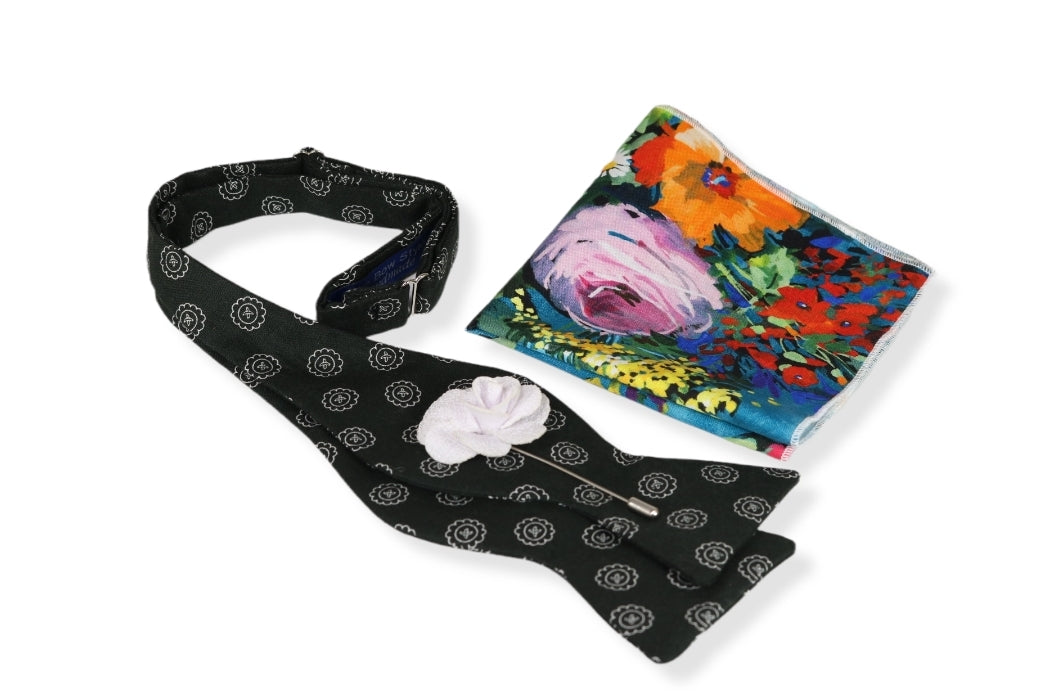 Individually handcrafted by The Bow Style to elevate the style of a gentleman. The black and white medallions premium cotton bow tie is paired with the goya floral pocket square with vibrant colors of white, green, blue, purple, red, black, yellow and gray and a white floral lapel pin. Perfect dapper details for business, fun, casual or formal occasions. When ordinary is not an option these sets are ideal as gifts that will bring lots of compliments and attention.