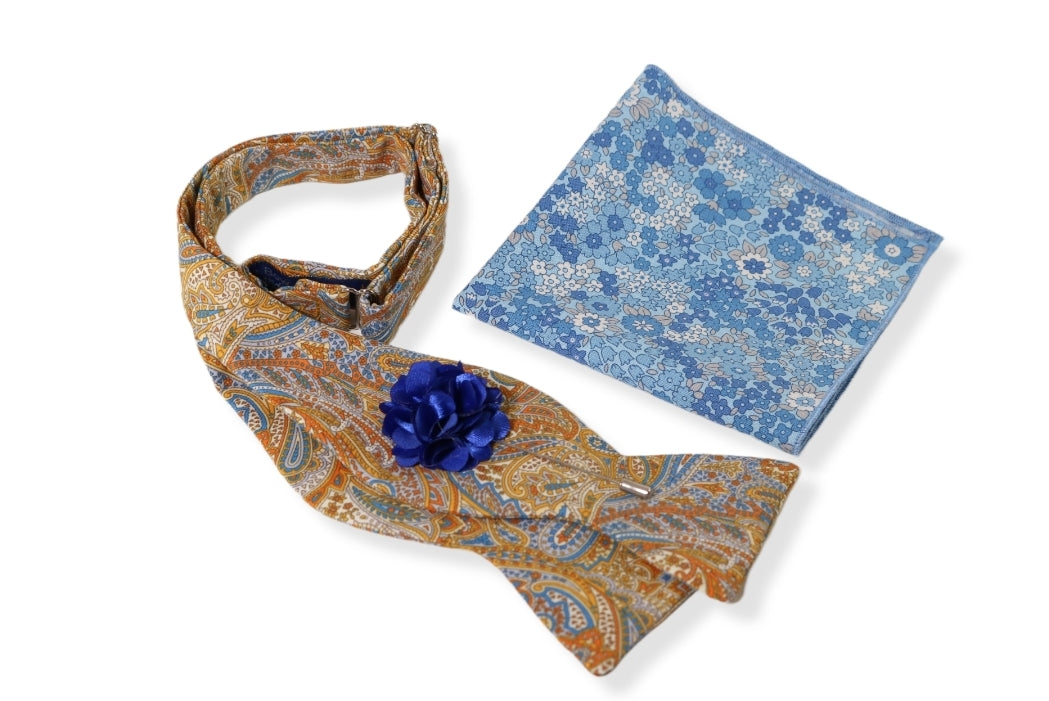 Individually handcrafted by The Bow Style to elevate the style of a gentleman. The pietro paisley blue gold, gray and white bow tie paired with the dagan floral blue, gray and white rolled hem pocket square with a gold floral lapel pin. Perfect dapper details for business, fun, casual or formal occasions. When ordinary is not an option these sets are ideal as gifts that will bring lots of compliments and attention.
