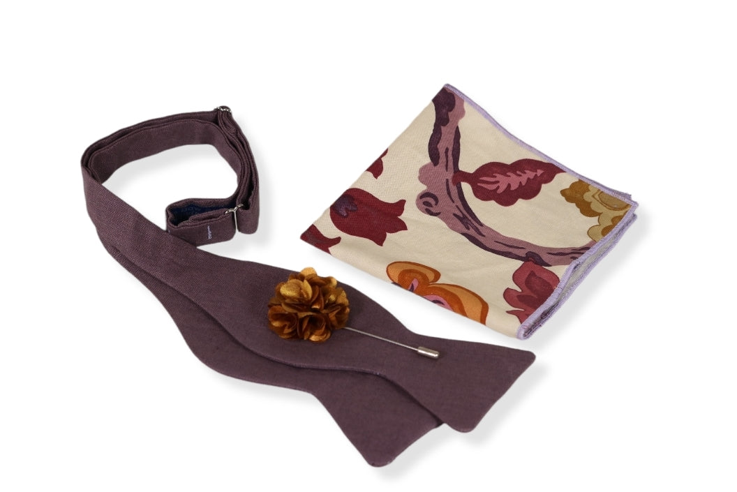 Individually handcrafted by The Bow Style to elevate the style of a gentleman. The plum premium linen bow tie is paired with the mulberry floral rolled hem pocket square with a bronze floral lapel pin. Perfect dapper details for business, fun, casual or formal occasions. When ordinary is not an option these sets are ideal as gifts that will bring lots of compliments and attention.