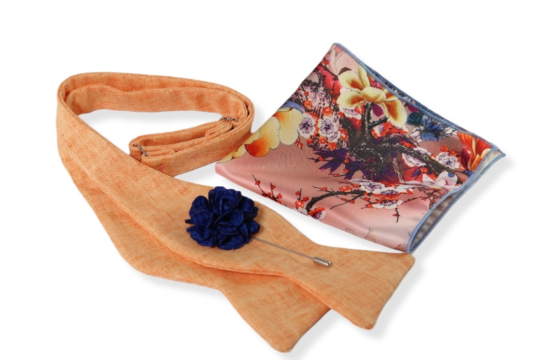 Individually handcrafted by The Bow Style to elevate the style of a gentleman. The preferito orange linen bow tie paired with the floronubo floral pocket square with a blue floral lapel pin. Perfect dapper details for business, fun, casual or formal occasions. When ordinary is not an option these sets are ideal as gifts that will bring lots of compliments and attention.