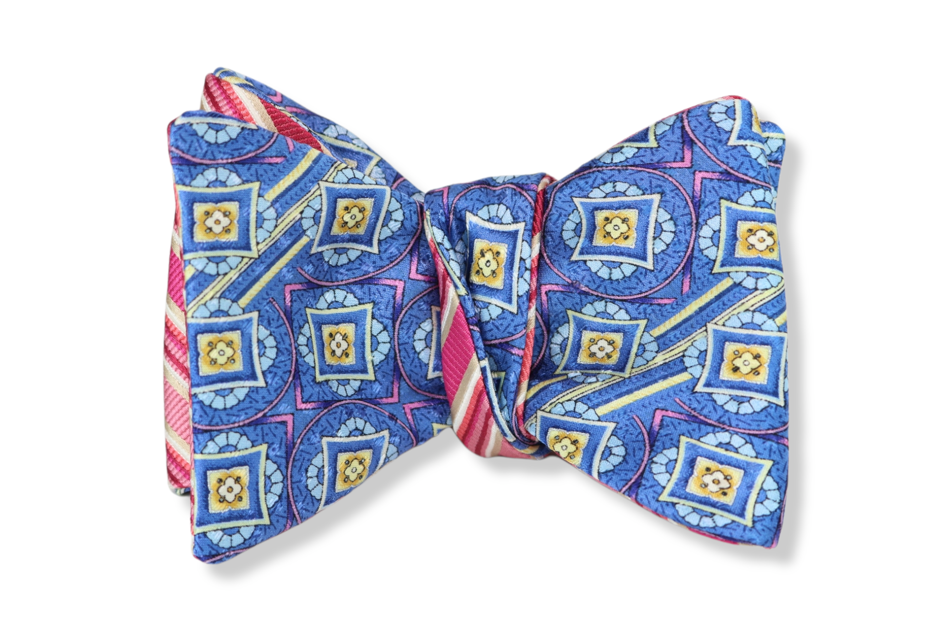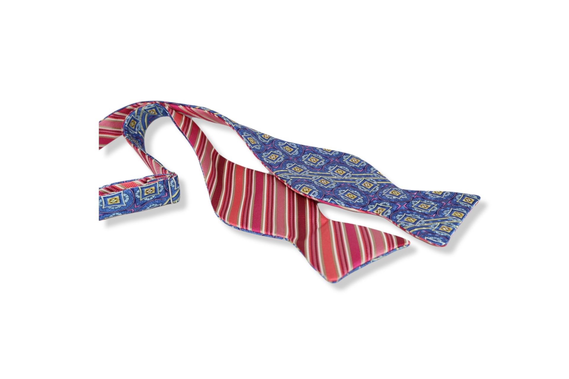 A self-tie bow tie never goes out of season. Blue, pink and gold geometric pattern and pink and white striped pattern makes an amazing bow tie. It easy transforms from casual, formal or business depending on the occasion. Perfect for a blue, gray, beige, black or gold suit.