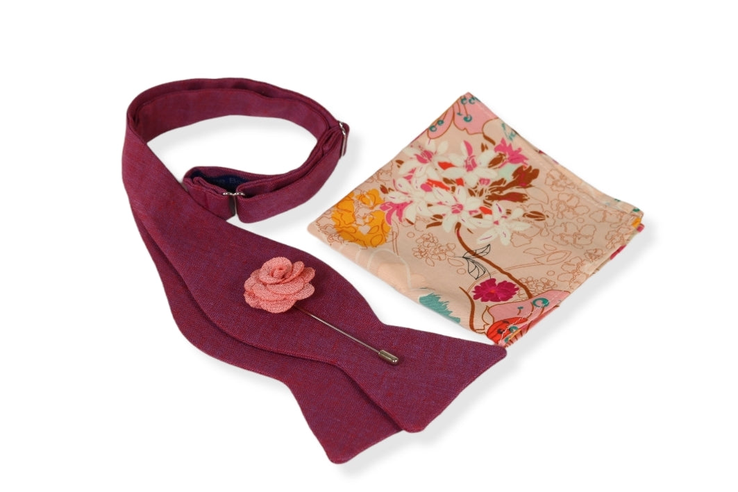 Individually handcrafted by The Bow Style to elevate the style of a gentleman. The sangria linen bow tie paired with the thebes floral green, buff, pink, rust and burgundy pocket square with a pink floral lapel pin. Perfect dapper details for business, fun, casual or formal occasions. When ordinary is not an option these sets are ideal as gifts that will bring lots of compliments and attention.