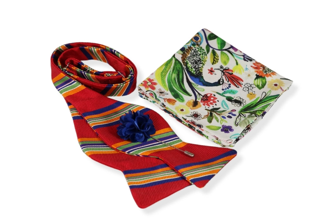 Individually handcrafted by The Bow Style to elevate the style of a gentleman. The sorohan red stripe woven silk bow tie is paired with the boho fancy floral pocket square with vibrant colors of blue, green, gold and red and a blue floral lapel pin. Perfect dapper details for business, fun, casual or formal occasions. When ordinary is not an option these sets are ideal as gifts that will bring lots of compliments and attention.